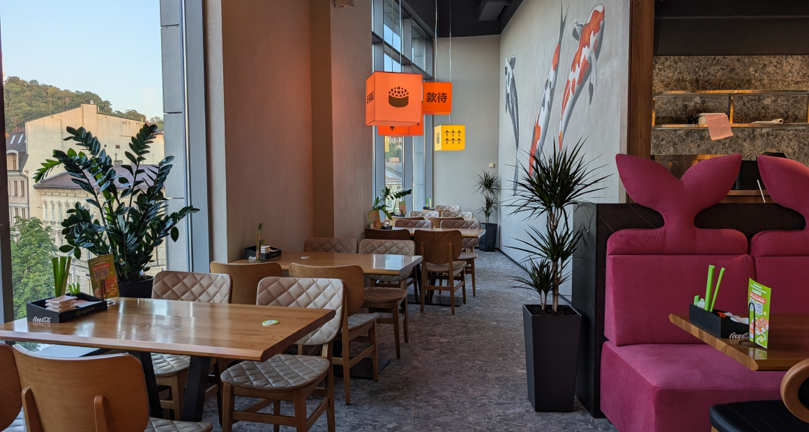 Інтер'єр ресторану просочений темою повітря. Просторий зал здається справжнім open-space: стіни і перегородки зроблені зі скла або світлого дерева. Світло-сірий відтінок на стінах рясніє назвами міст. А під стелею наче літає цілий розсип різноколірних світильників, які нагадують японські ліхтарики. Гості можуть розташуватися в залі або вийти на літню терасу. З неї відкривається чарівний вид на центр міста. Для маленьких любителів східної кухні у нас є дитячий куточок зі всілякими розвагами.