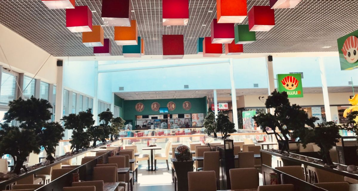 Интерьер заведения оформлен в традиционном для сети ресторанов "Сушия" стиле, преобладают яркая оранжевая и спокойная зеленая цветовая гамма. По залу стоят удобные мягкие кресла и диваны, где можно хорошо отдохнуть после утомительного шопинга. Также в заведении большие панорамные окна, из которых хорошо видна автомобильная парковка: гости могут постоянно наблюдать за своим личным транспортом.