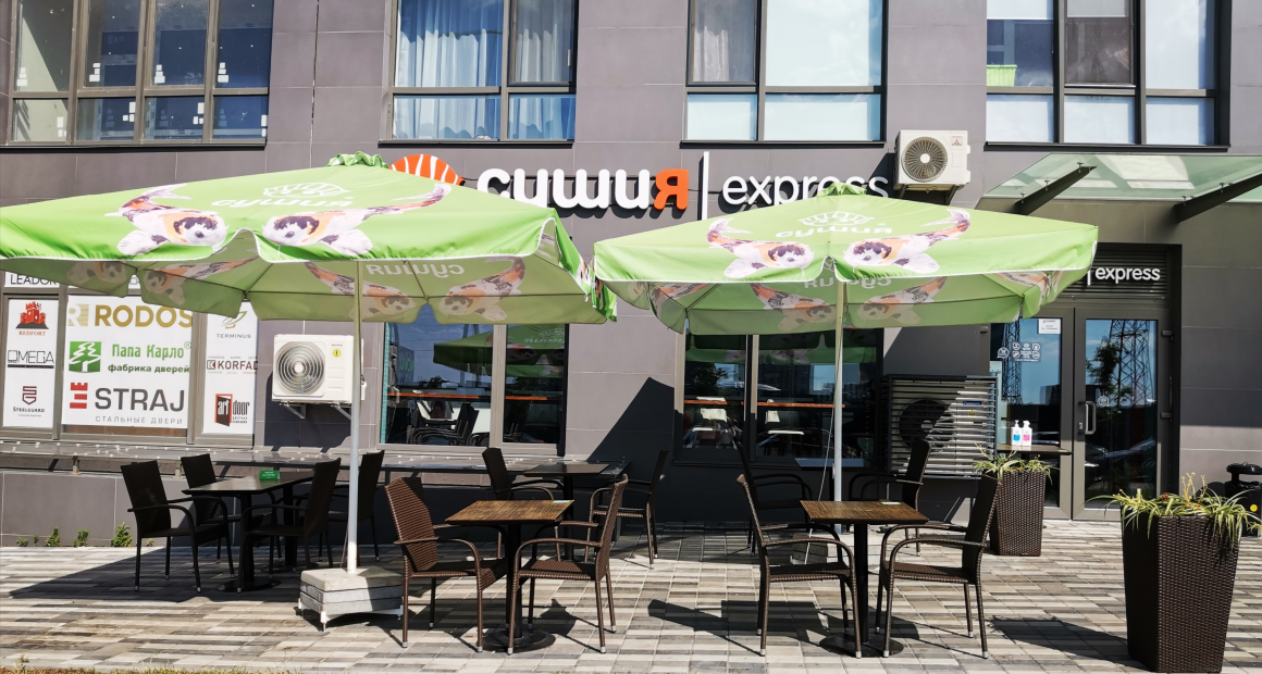 Ресторан "Сушия" формата "Экспресс" расположен в Подольском районе Киева, в большом современном ЖК "Варшавский" на ул. Семьи Кристеров, 20. В ресторане всего 8 мест, но в теплое время года работает летняя площадка.