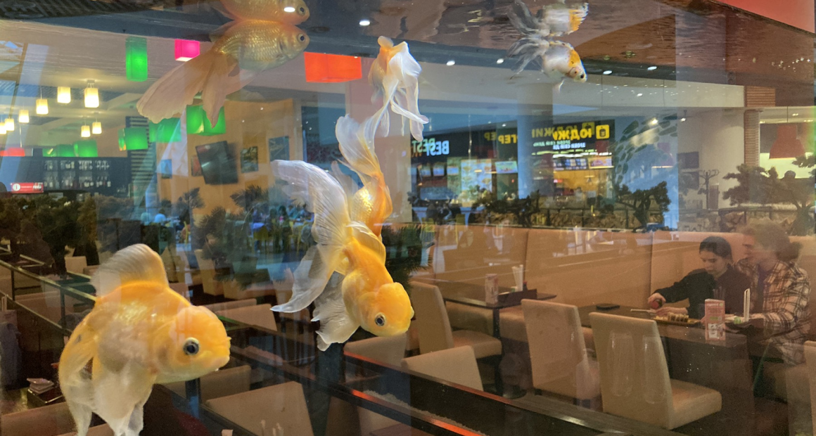 Ресторан выполнен в традиционной для "Сушия" цветовой гамме, в стандартном стиле. Главной изюминкой ресторана является большой аквариум, который нравится юным гостям "Сушия". Привлекают внимание и миниатюрные декоративные деревья, размещенные по всему периметру заведения. Это один из крупнейших ресторанов сети с вместительностью более 150 человек.